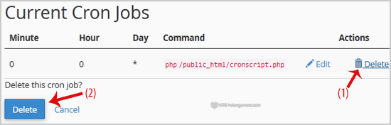 1. מתחת ל"משימות מתוזמנות נוכחיות" (Current Cron Jobs) אתר את העבודה המתוזמנת שברצונך לערוך ולחץ על "מחק" (Delete).