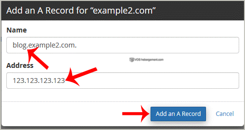 3. לחץ על "A Record+" וחלון קטן יקפוץ. כנס את הפרטים הנחוצים בשדות המתאימים.